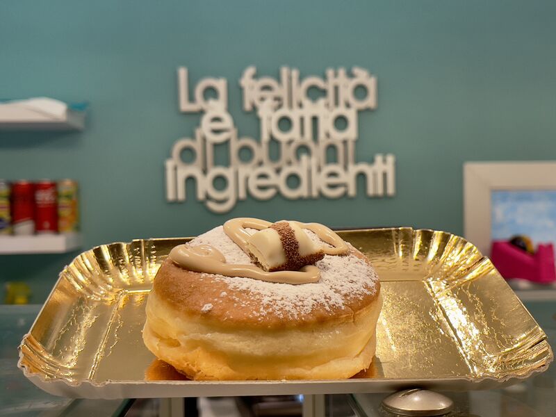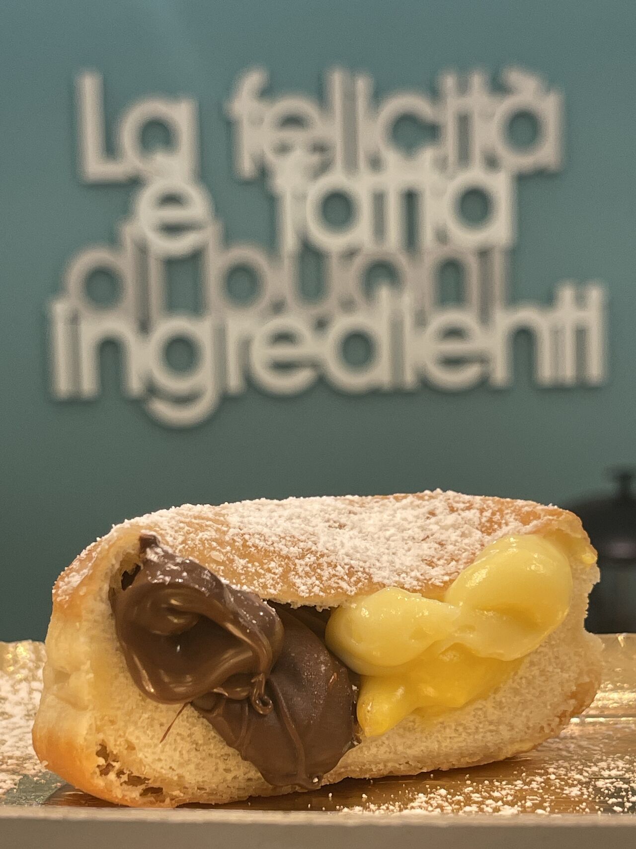 E mentre lo mangi in piedi al bancone (perché è impossibile aspettare di sedersi), senti il calore che ti scalda le mani attraverso la carta velina, lo zucchero a velo che ti imbianca le dita e quel “plop” soddisfacente quando la crema calda incontra la lingua.