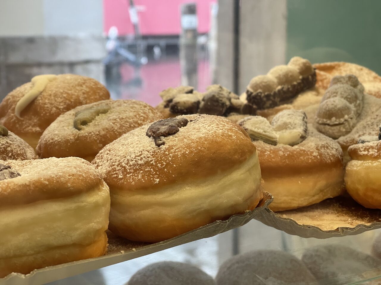 Il bancone è una festa per gli occhi. File di krapfen appena usciti dalla friggitrice, gonfi come piccoli palloncini dorati, vengono presi uno a uno con la pinza e farciti al momento con crema, pistacchio, marmellate, cioccolato bianco
